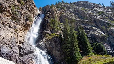 Burkhan-Bulak Waterfall is the highest and most beautiful waterfall in Central Asia. It's located in the Dzungarian Alatau Mountains, in the gorge of the Kora River. Its total height is 168 m (551 ft), although its highest cascade is not visible from the ground. Its visible part, consisting of three cascades, is 114 m (374 ft) high. The waterfall is situated at an altitude of 2000 m (6500 ft) above sea level.